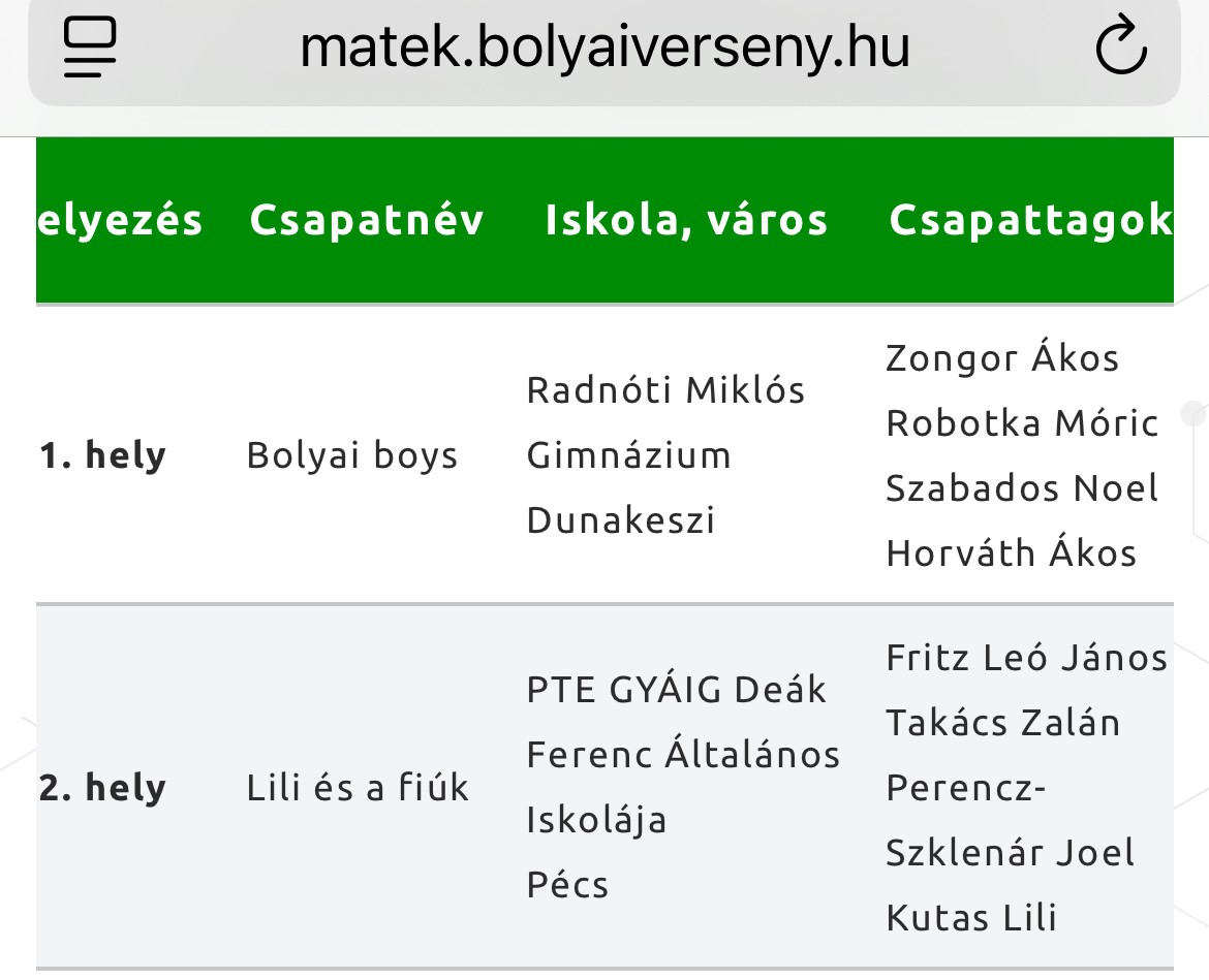 2025-12-01 November 29-én lezajlott a Bolyai matematikaverseny országos szóbeli döntője, ahol a 6. évfolyam diákjai 2. helyezést értek el.Gratulálunk ehhez a gyönyörű eredményhez!