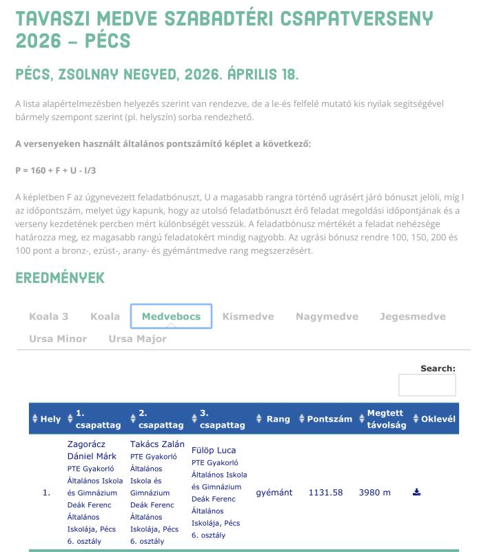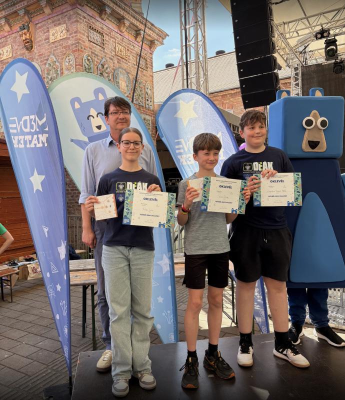 2026-04-21 Pécsett, a Zsolnay Negyedben megrendezett tavaszi Medve szabadtéri csapatversenyen Medvebocs (5-6. osztály) kategóriában első helyezést ért el a 6.bc-csapat, melynek tagjai:Fülöp Luca (6.c), Zagorácz Dániel Márk (6.c) és Takács Zalán (6.b).Gratulálunk ehhez a szép eredményhez!